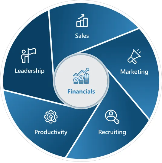 Our Health & Value Assessment evaluates your business across the six areas that drive enterprise value: Financials, Sales, Marketing, Leadership, Recruiting, and Productivity.